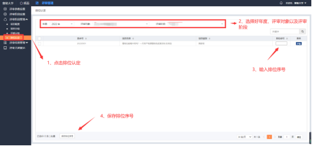 点击左侧菜单栏中的“排位认定”,选择好年度、评审对象以及评审阶段后,会显示进入评审的项目,可以在项目后输入排位序号,输入好之后,点击左下角的保存即可;