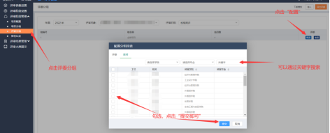 分完组后,点击左侧菜单栏中的“评委分组”,可以显示出刚刚分好的组(详见3.2项目分组),如需分配评委,请点击相对应组别右侧的“配置”,在弹出的对话框内可以通过关键字来搜索到评委,点击“提交”即可配置成功;