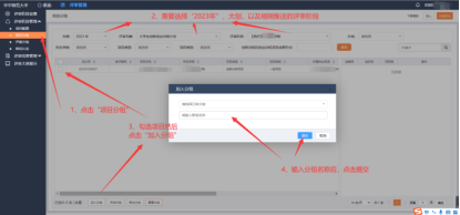 点击“项目分组”,然后选择好年度以及刚刚推送正确的评审阶段,然后勾选项目,点击左下角的“加入分组”,输入好分组的名称之后,再点击“提交”即可。
