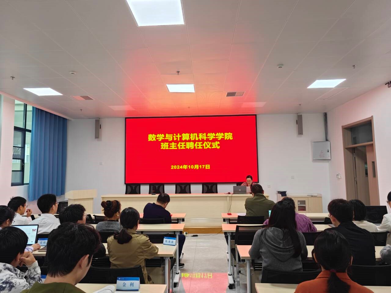 2024年10月17日下午,沙巴官网顺利召开2024年班主任聘任仪式。数计学院院长李岱、分党委书记张玉龙、学工办主任董蕾、全体班主任和辅导员老师参加了本次仪式。