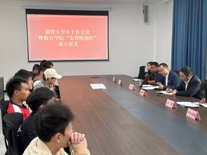为深入贯彻习近平总书记关于退役军人工作的重要指示精神,弘扬爱国主义精神,培育学生的团队协作精神和社会责任感,进一步做好退役大学生的思想引领和服务保障工作,数计学院于10月24日下午在明理楼B301隆重举行了退役大学生工作会议暨数计学院“尖锋模范队”成立仪式。院党委书记张玉龙,相关辅导员、各年级退伍大学生参加了此次会议。院党委副书记王思源主持会议。